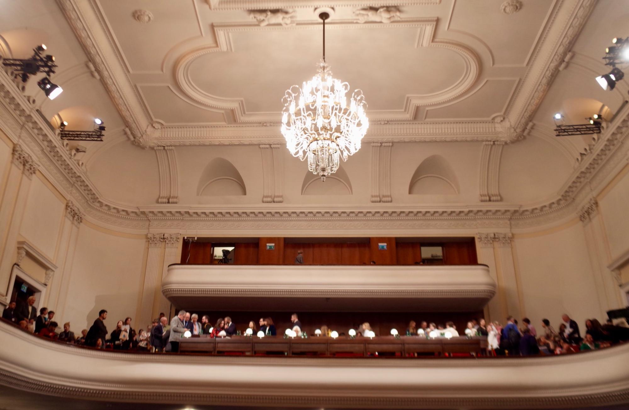 会場のホールは三階席まであります。天井からはシャンデリアが吊り下げられ、古典的で重厚な雰囲気を湛えています。